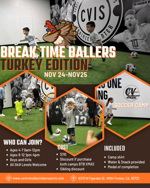 Join us this Thanksgiving break for a fun 2-day soccer camp at Central Valley Indoor Sports! Open to boys and girls ages 4–12 of all skill levels. Camp includes skill training, games, a camp shirt, snacks, and a medal of completion.
